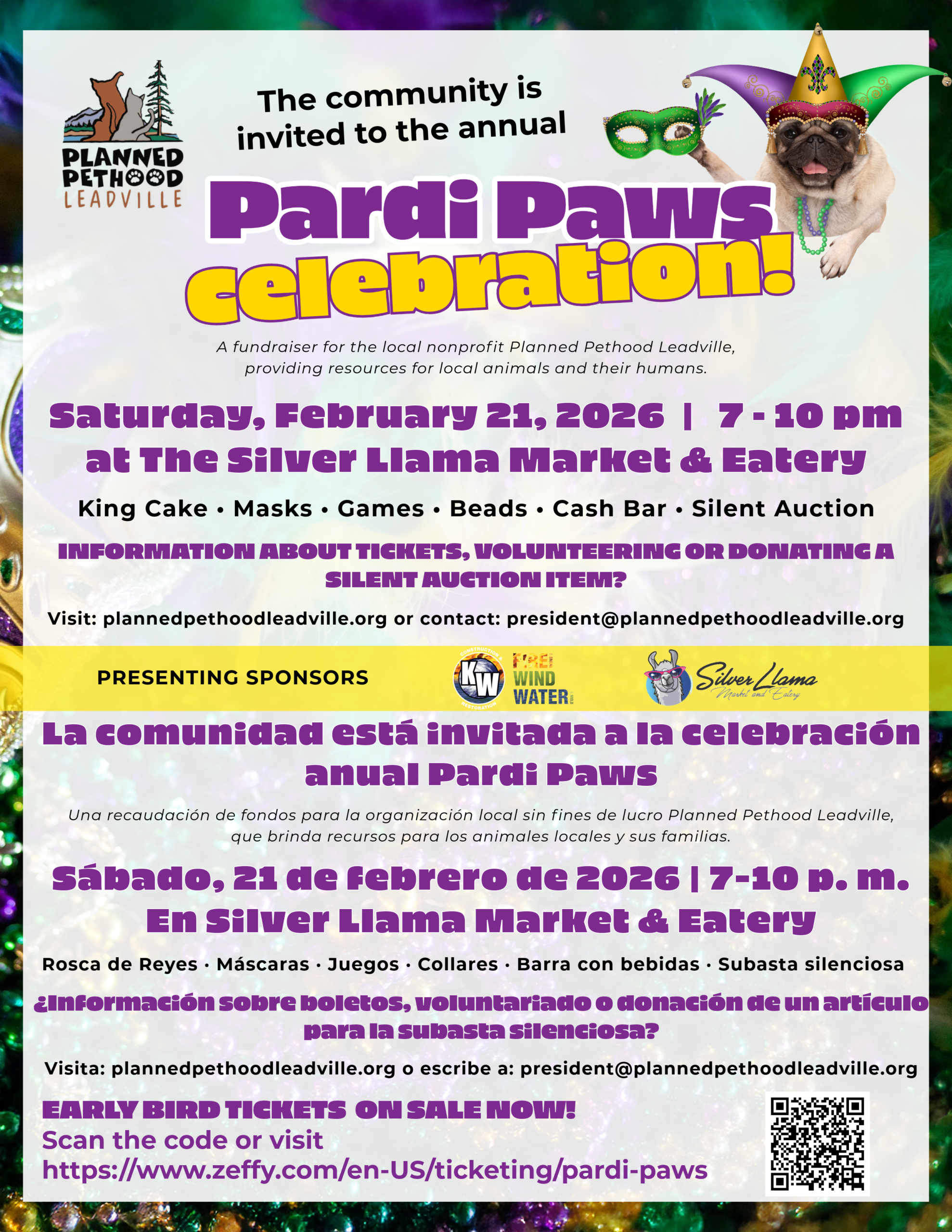 Join Planned Pethood Leadville’s Krewe Chewbarkus for a night of New Orleans style fun at our biggest annual fundraiser. Enjoy delicious food, entertainment, a cash bar, king cake, games, masks, beads, and a silent auction, all to support local pets in need.